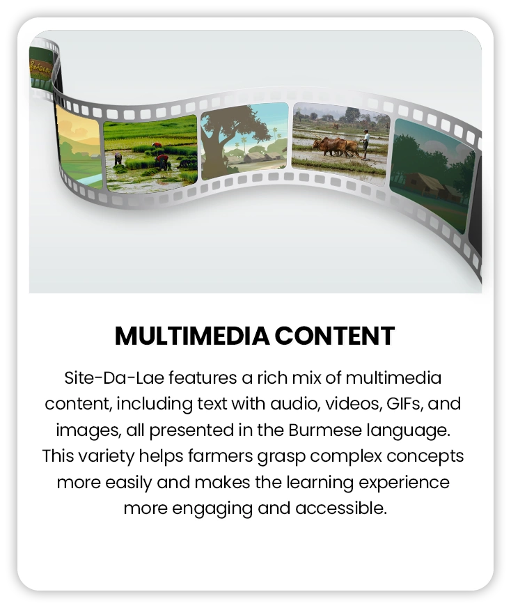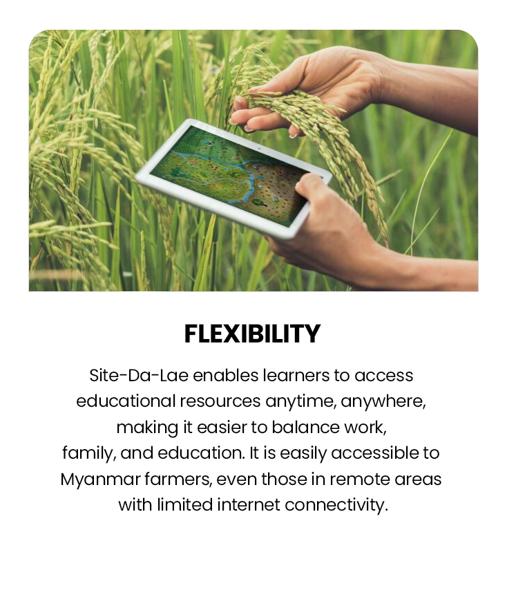 With the help of Site-Da-Lae, farmers and community members who can read and write in the Myanmar language and have lower-end smartphones with limited or no regular internet connectivity can gain access to essential knowledge on sustainable agriculture. The app ensures that vital agricultural information reaches those who need it most, empowering them to make informed decisions, reduce risks, and improve their livelihoods.