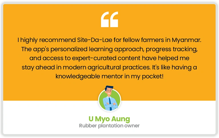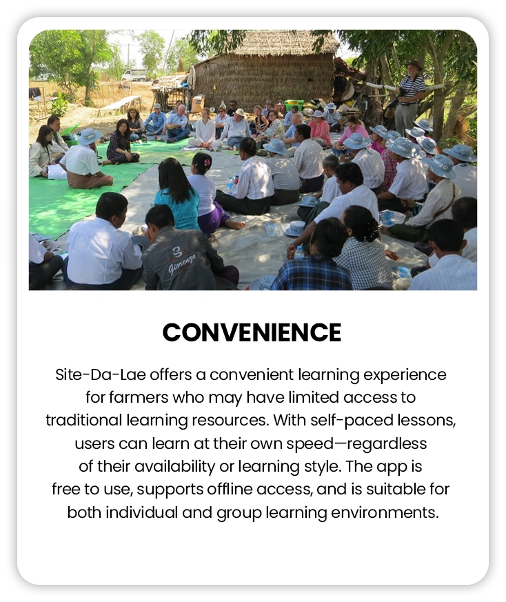 Site-Da-Lae is an app for agricultural learning aid, designed to help farmers in Myanmar to increase their knowledge and provide accessible information on sustainable agriculture and farming practices.