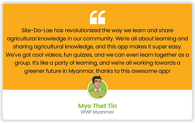 In collaboration with WWF Myanmar, 360ed developed Site-Da-Lae to directly respond to the need for accessible agricultural knowledge among Myanmar’s rural communities. Its key objective is to raise awareness and understanding of sustainable farming practices through expert-backed content tailored for local farmers.