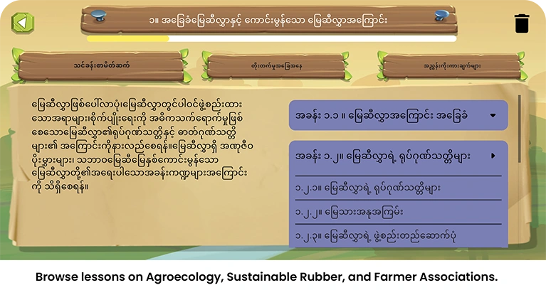 The content focuses on key topics such as Agroecology Practices, Sustainable Natural Rubber, and Organizing Farmer Associations. Lessons are delivered through audio guides, educational videos, quizzes, and self-paced learning modules—making it easier for farmers to learn anytime, anywhere.